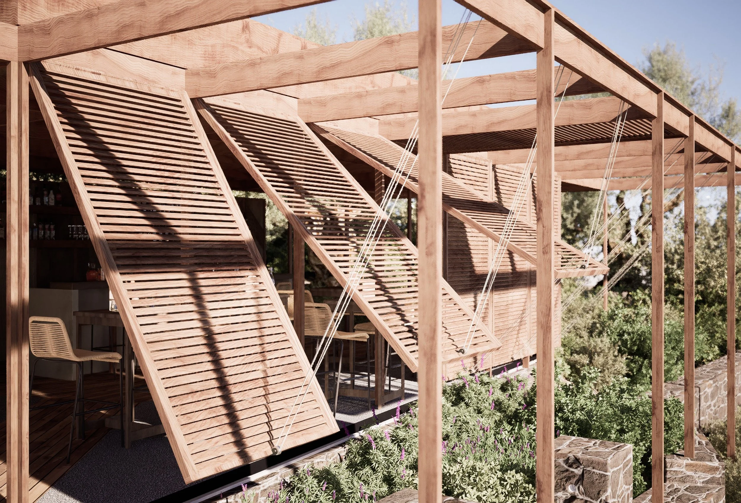 Σε έναν ελαιώνα της Κρήτης, σχεδιάστηκε ένα ελαφρύ ξύλινο στέγαστρο, κάτω από το οποίο αναπτύσσεται ένα lounge bar — ένας χώρος δροσιάς, συνάντησης και ξεκούρασης, απόλυτα ενταγμένος στο μεσογειακό ανάγλυφο.